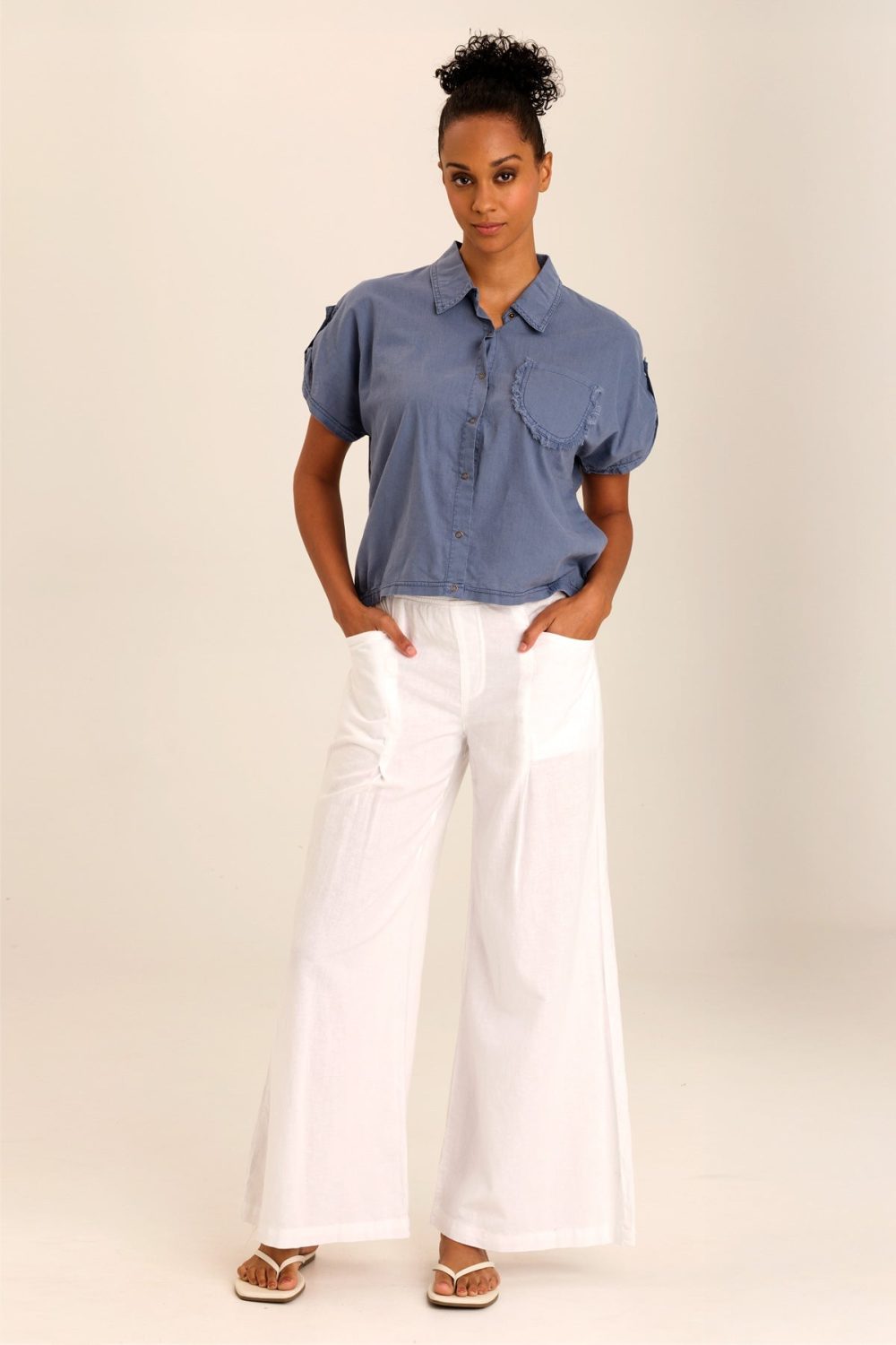 In a cotton linen blend, Abner features a traditional collar, dolman sleeves, raw-edge patch pockets, a ruched hem with elastic sides, tabbed short sleeves, and contrasting back side panels in slub jersey.
