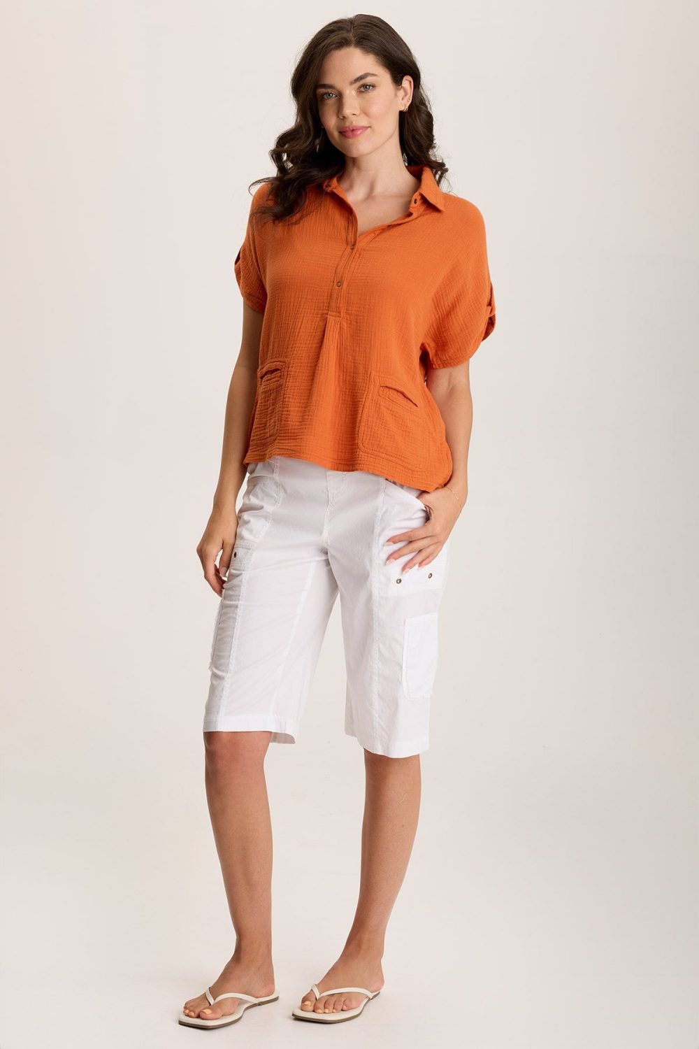 Textured double gauze, a classic lapel style with snap-up details and a central pleat are featured on this tabbed short-sleeve blouse with welt pockets on either side near the hem.