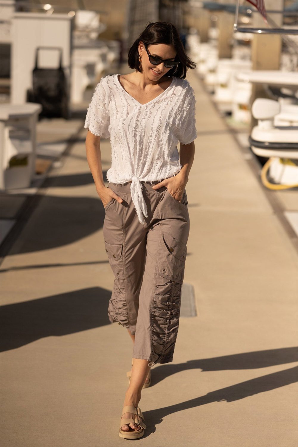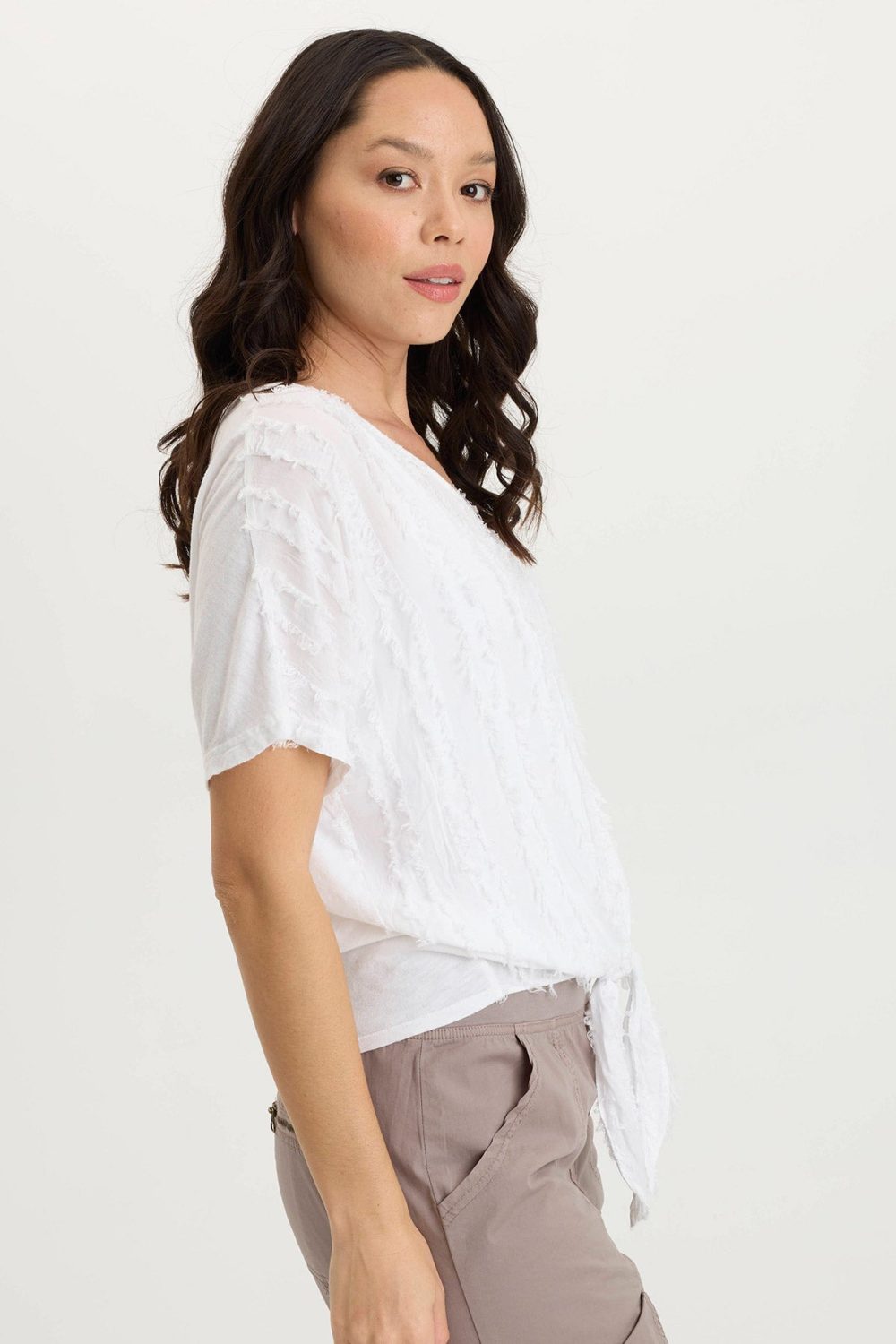 Curine V-neck has a tie front and a slightly oversized silhouette. Featuring a shredded stripe voile and a slub jersey contrast back.